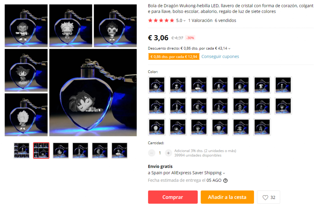 Si nos fijamos, en la siguente captura podemos ver que el llavero tiene un precio de 3,06€ y no aparece reflejado nada relacionado con el IVA del producto.